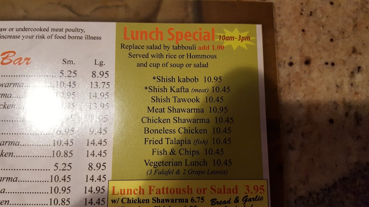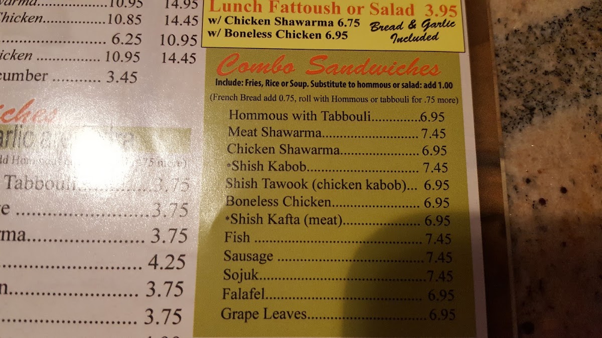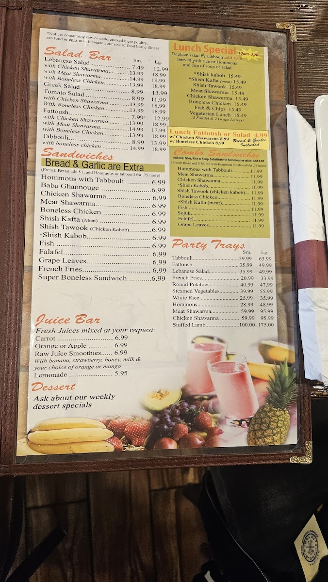 Alongside the main dishes, there are fresh salads such as Fattoush and Grilled Chicken Salad, light soups, and an assortment of beverages including iced tea and natural fruit juices that round out the meal. These thoughtfully prepared items fit well with the warm, homey atmosphere, making it easy to unwind and enjoy good company.