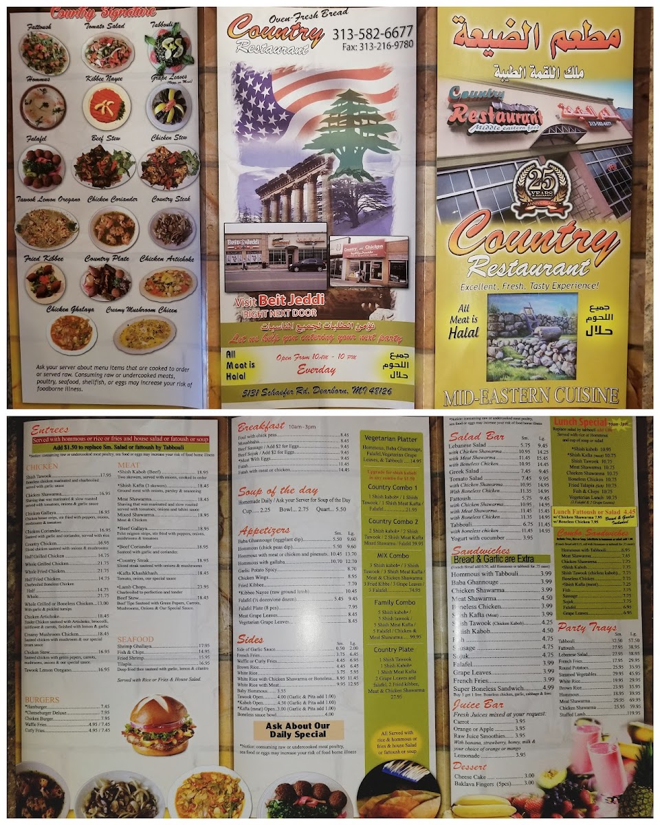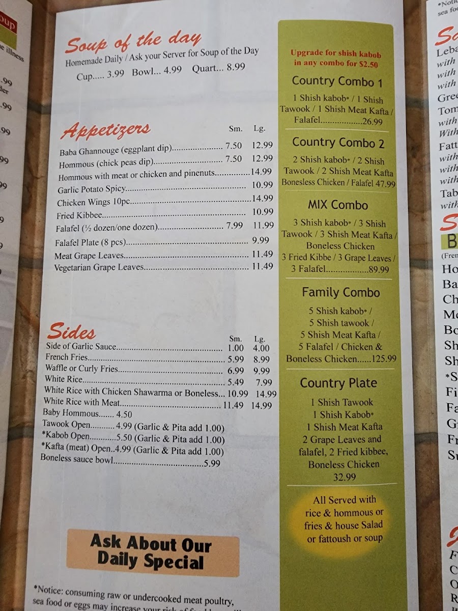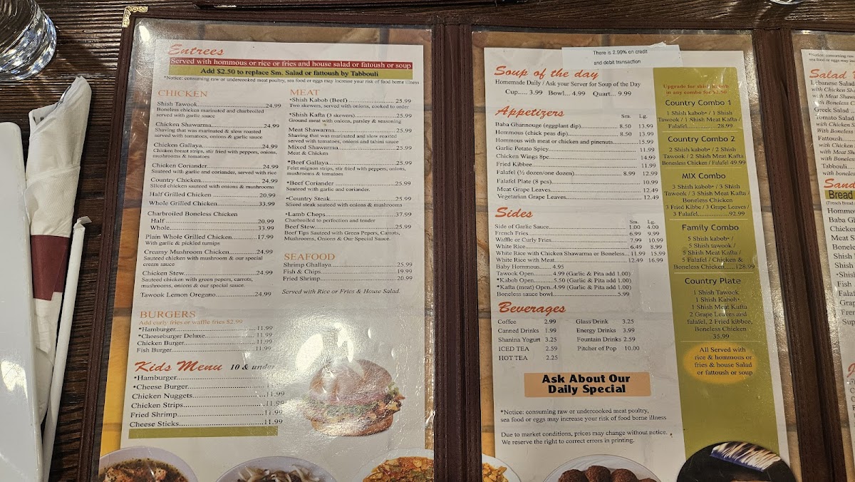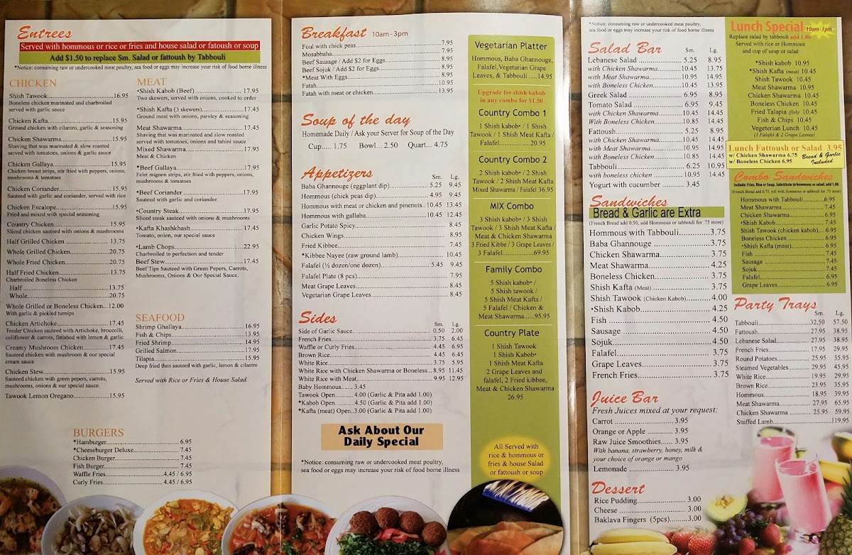 Country Chicken offers a welcoming Mediterranean menu that blends simple, hearty dishes with familiar, comforting flavors. The menu features a mix of casual bites and satisfying plates, perfect for enjoying a relaxed lunch or a cozy dinner. Whether you’re stopping by for a flavorful sandwich like their falafel or Shish Kabob, savoring a shared Country Plate, or pairing fresh breads with creamy garlic sauce and hummus, the menu invites a comforting and unhurried dining experience.